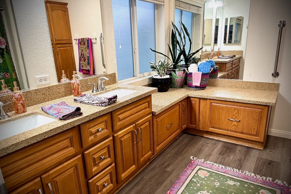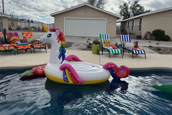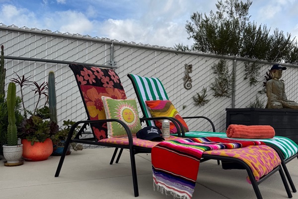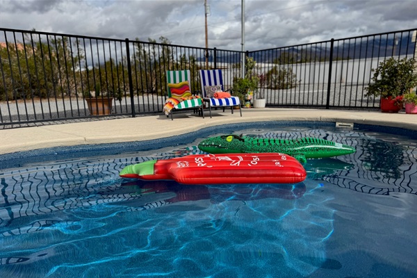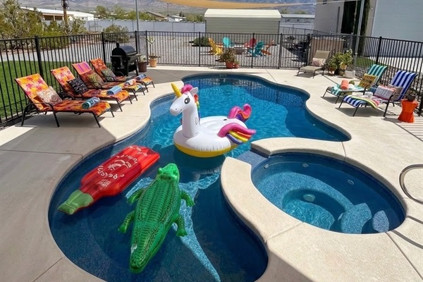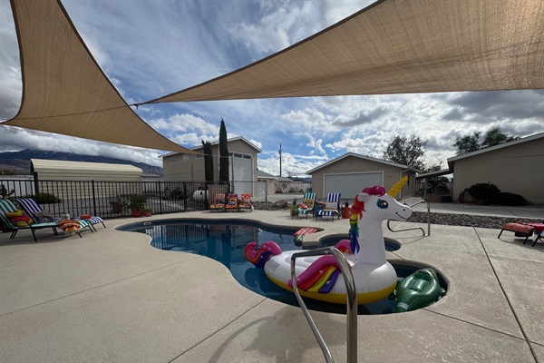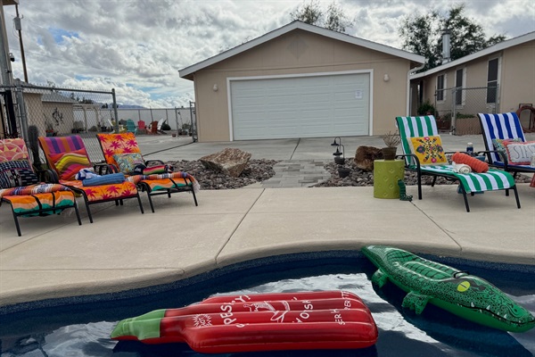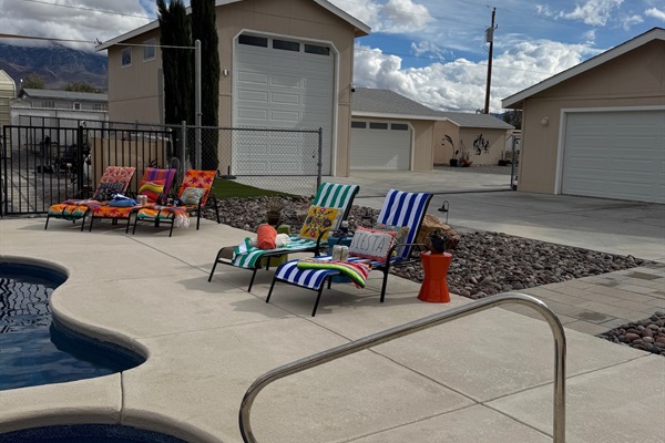 Pool loungers & massive patio space for relaxing in the desert sun.